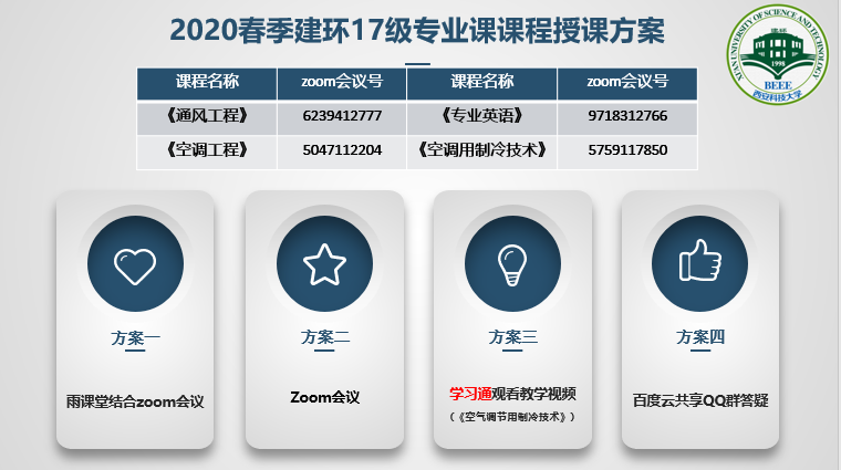 本学期建环专业17级有《空调工程》、《通风工程》、《空气调节用制冷技术》、《专业外语》等多门课程,针对专业课程多的特点,建环17级授课的老师们组建了互助教学团队,为了减轻员工们的负担,统一了学习平台,同时为了防止授课期间网络拥堵的情况,制定了四种方案,为下周的网络授课奠定了一定的基础。