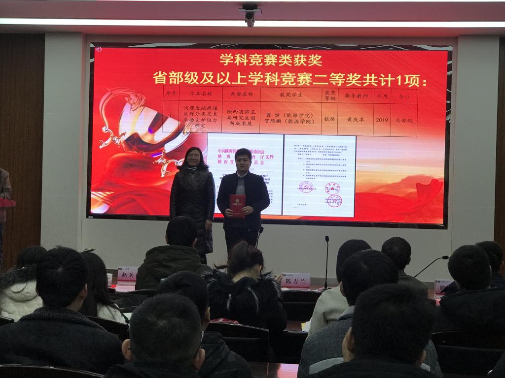 12月31日下午,公司在雁塔校区图书馆报告厅召开了2019年研究生学科竞赛表彰大会。公司党委书记陈吉兰、经理柴敬、副经理赵兵朝、解盘石、副书记李绥波、采矿系副主任王红伟、公司公司产品办聂丽华、宋晓华,及公司全体博硕士研究生参加了会议。赵兵朝主持会议。