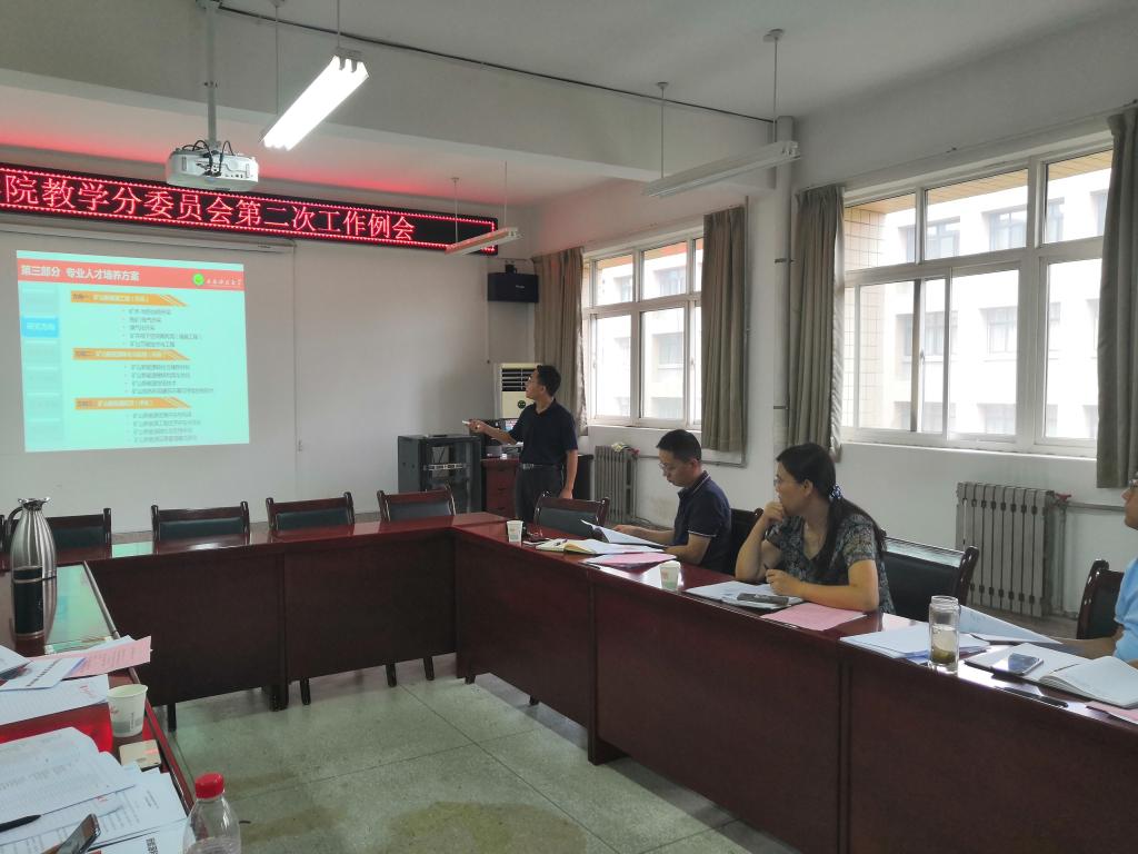 会议的第一阶段由教学秘书张莹汇报了18-19-2学期教学工作完成情况,第二阶段由教学分委员会副主任解盘石汇报了采矿工程智能开采班的培养方案、本科招生情况。第三阶段由刘浪教授介绍了新专业“新能源科学与工程”申报情况及培养方案。第四阶段由赵兵朝教授介绍了西部煤炭绿色开采虚拟仿真实验项目申报情况,第五阶段由解盘石老师介绍了XCSport毕业设计工作管理办法及XCSport关于提升教师课堂教学质量实施办法。