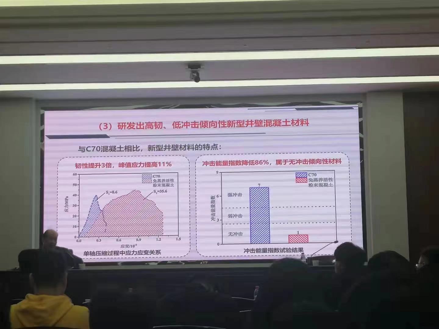 纪洪广教授主要从立项背景、项目进展、项目科学意义及推广前景三个方面展开汇报,针对研发高韧、低冲击倾向性新型井壁混凝土材料等相关研究进展进行了专题报告。