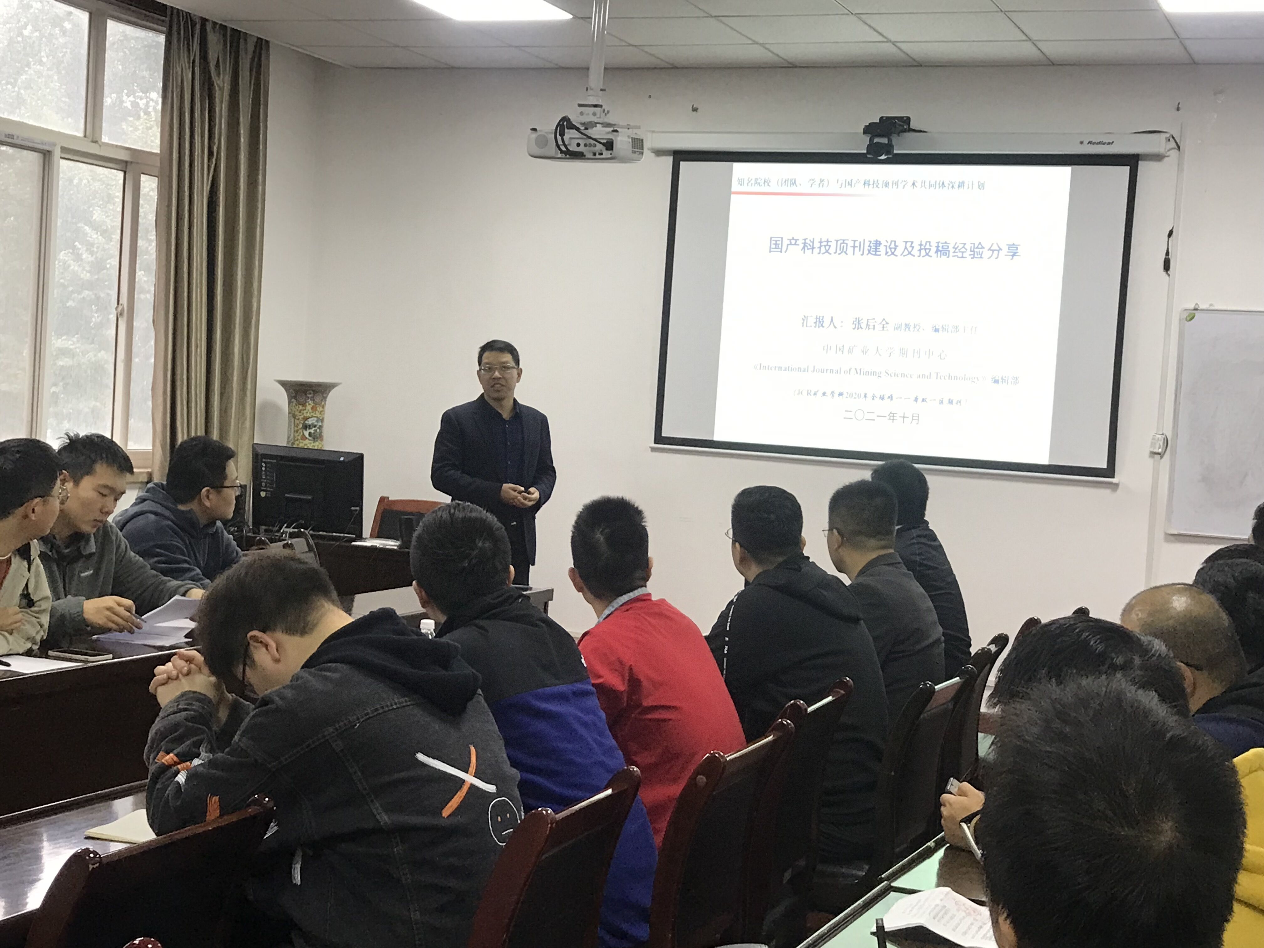 2021年10月14日上午9时,中国矿业大学期刊中心编辑部主任张后全副教授于采矿楼310会议室为XCSport师生做了题为“国产科技顶刊建设及投稿经验分享”的学术报告。XCSport部分教师及全体博硕士研究生参加,本次报告会由采矿系主任丁自伟教授主持。