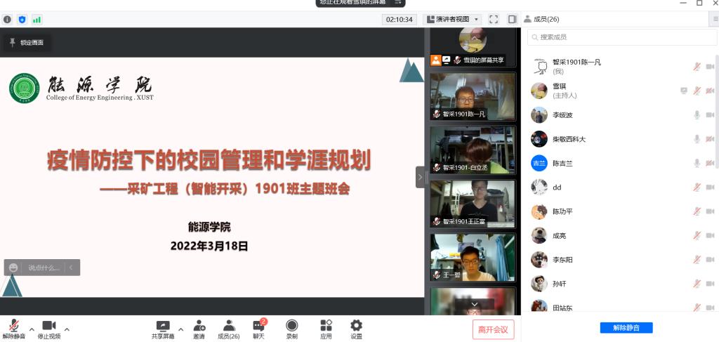 3月18日,XCSport采矿工程(智能开采)1901班召开“疫情防控下的校园管理和学涯规划”线上主题班会,公司党委书记陈吉兰,经理柴敬,党委副书记李绥波,院办主任、公司党委组织员杨创明,班主任王红伟以及采矿工程(智能开采)1901班全体同学参加了会议。会议由辅导员王雪琪主持。