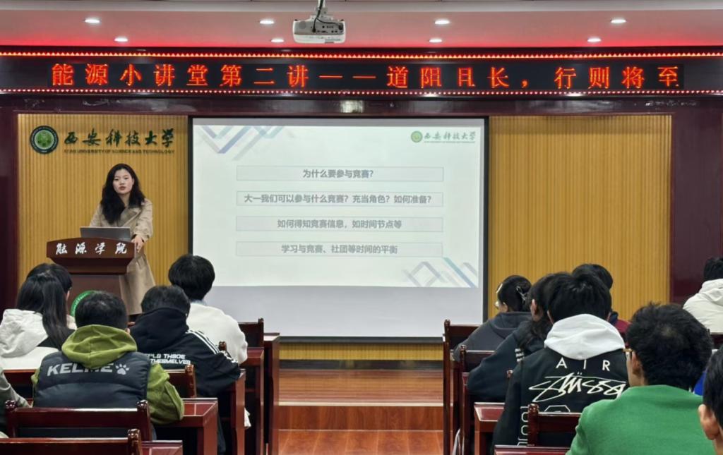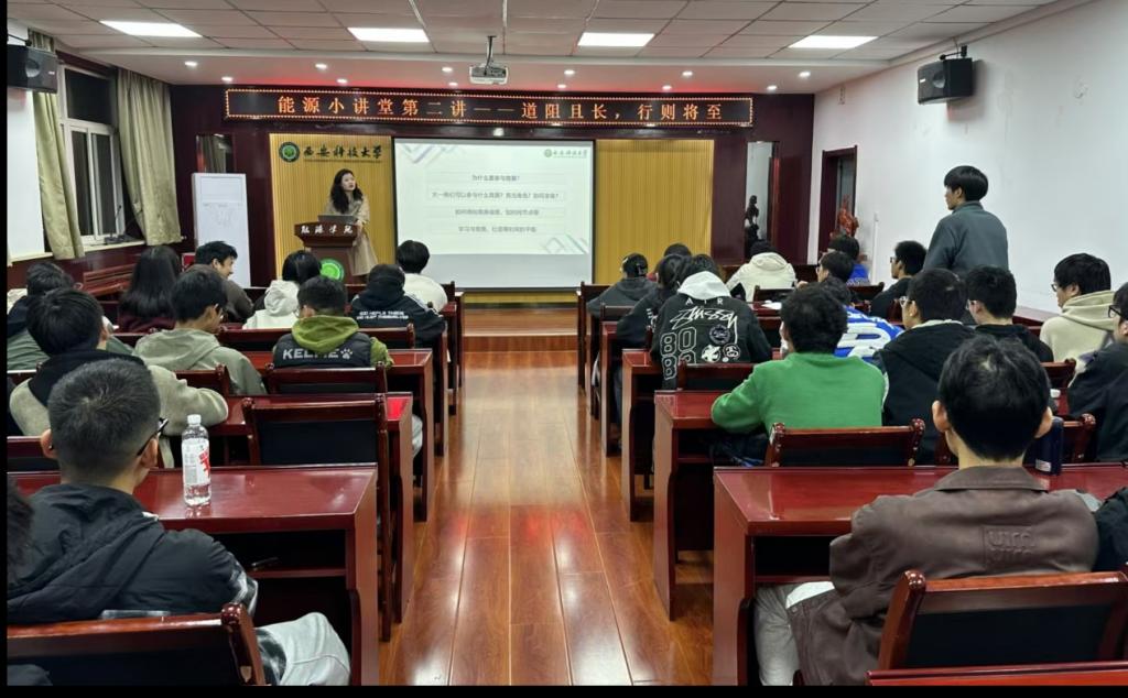 11月7日晚,能源小讲堂第二讲——“道阻且长,行且将至”交流会在临潼校区骊山校园公司会议室举办。建环2101班周振杰与23、24级部分同学进行了交流。