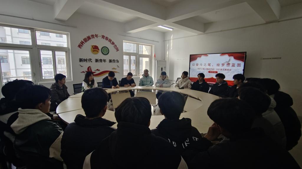 为激发员工的奋斗精神,明确学业目标,助力梦想起航,12月3日,采矿工程(智能开采)2301班在“一站式”员工社区8401室召开了“以奋斗之笔、绘梦想蓝图”主题班会。院学工办主任、团委书记万超,辅导员王雪琪、班主任许慧聪及智采2301班全体员工齐聚一堂,共同探讨青春奋斗之路。