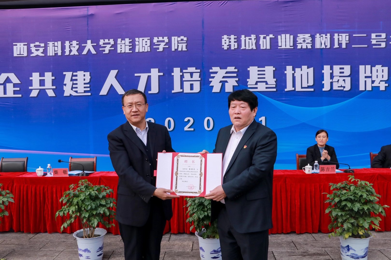 柴敬与鱼振元签署了《校企共建人才培养基地协议书》,陈吉兰、李炳好共同揭牌,同时聘任鱼振元为硕士研究生校外导师、李炳好为校外辅导员。柴敬对此次活动的隆重召开表示热烈的祝贺,他表示今后双方将在员工培训、科研攻关、人才培养、社会实践等方面开展合作,将对公司在建设国内一流、特色鲜明的高水平教学研究型大学的道路上,发挥更大的作用。