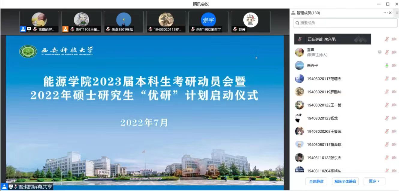 7月14日晚,公司2023届本科生考研动员暨“优研”计划启动仪式在线上举行,董事长来兴平出席会议并讲话,公司党委书记陈吉兰、经理赵兵朝、副经理朱明,相关工作负责人、辅导员及2023届全体本科生参加了会议,会议由公司党委副书记党雪主持。