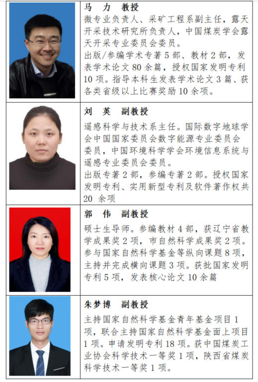 3.培养目标:立足于国家和地方战略发展需求,面向大型露天煤矿建设与生产等方面,培养矿山边坡工程与智能监测领域的创新型技术人才,为大型露天矿建设与运行提供关键人才保障。