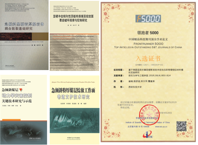 在岩石力学与工程学报、47th US Rock Mechanics/Geomechanics Symposium等国内外学术期刊与会议中发表论文60余篇,以第一作者发表的论文被SCI/EI收录二十多篇,1篇论文入选中国精品科技期刊顶尖学术论文。出版著作4部,授权发明专利9项,实用新型专利12项,软件著作权1项。