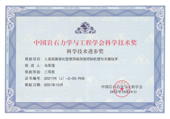 [3]人造弱面弱化坚硬顶板围岩控制机理与关键技术,中国岩石力学与工程学会科学技术奖(科技进步奖)二等奖,中国岩石力学与工程学会,2021年,排名:6/10。