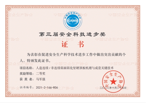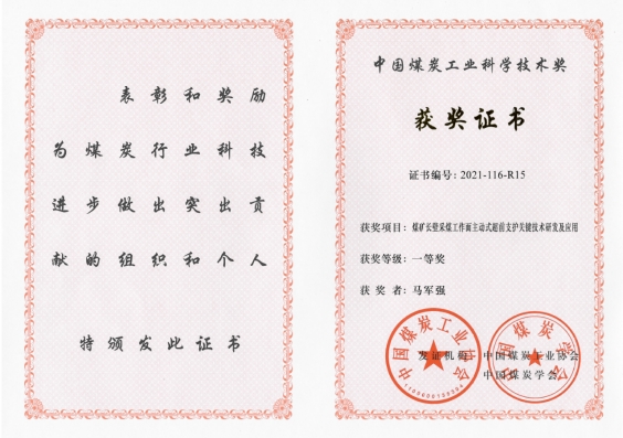 [2]煤矿长壁采煤工作面主动式超前支护关键技术研发与应用,中国煤炭工业科技进步一等奖,中国煤炭工业协会,2021年,排名:15/17。
